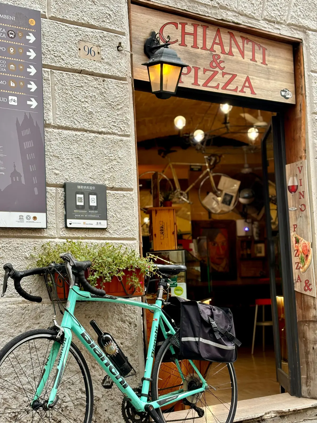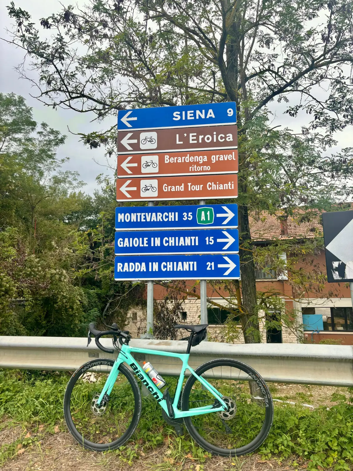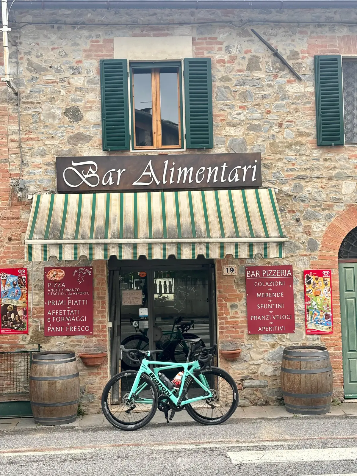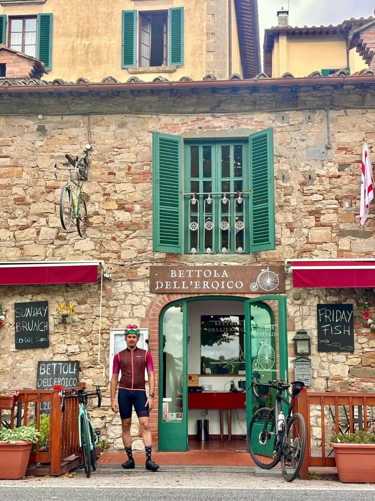 Gaiole was once one of the three capitals of the old Chianti League, alongside Castellina and Radda. Today, it’s a bit of a cycling pilgrimage spot — the starting point for the Strade Bianche and L’Eroica routes — with a relaxed piazza, stone buildings, and an easygoing rhythm. We’ll stop here for a coffee and soak in the atmosphere.