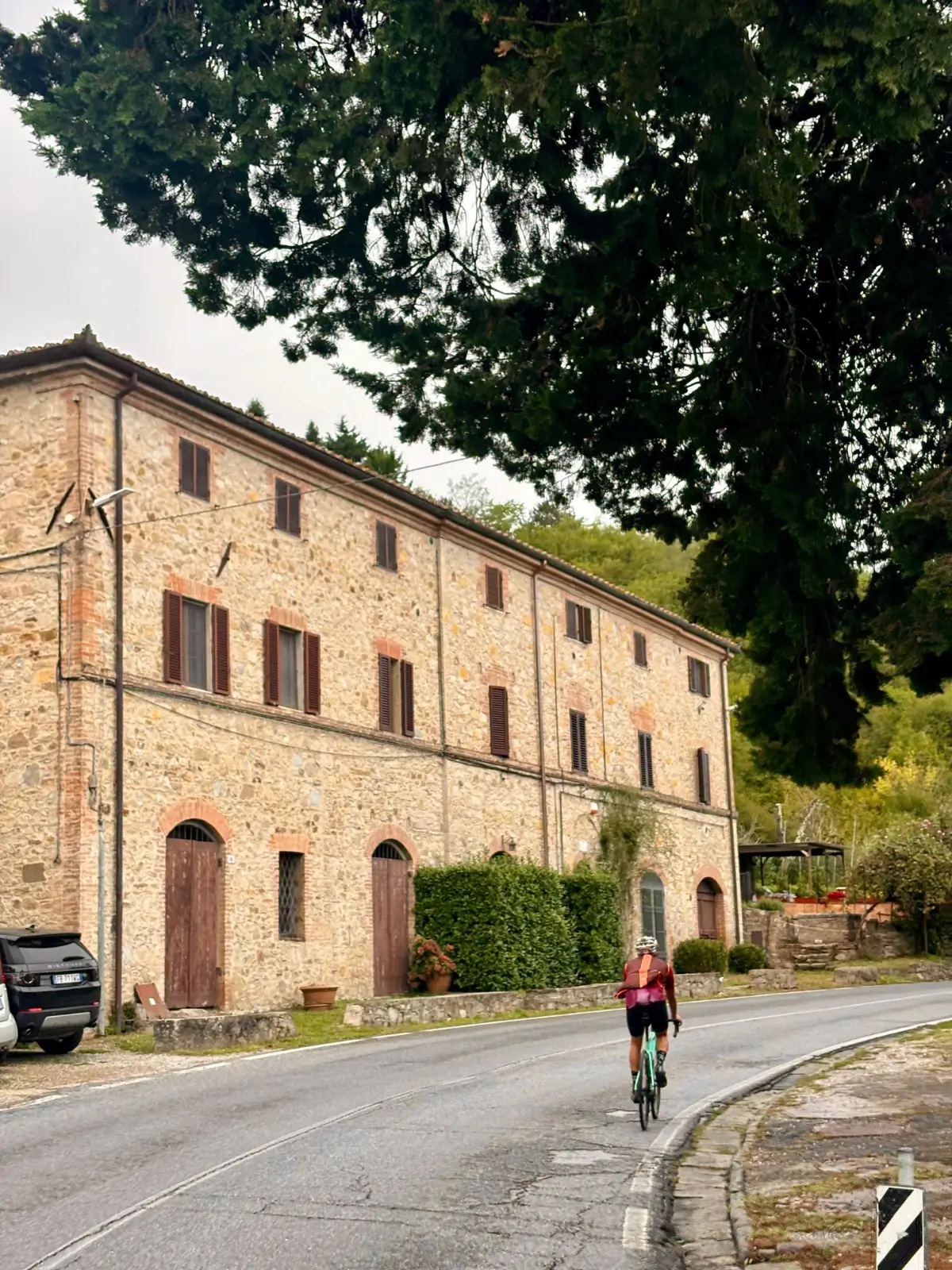 It’s a classic introduction to the region — rolling vineyards, short punchy climbs, stone farmhouses, and those sweeping views that Tuscany is famous for. We stop for coffee in Lecchi, then return to Radda via a different scenic route before rolling back into Castellina. In the evening, we gather for a relaxed welcome briefing followed by a hearty Tuscan dinner.
